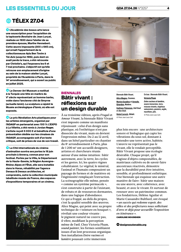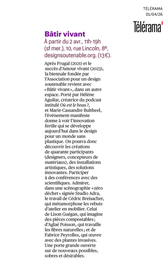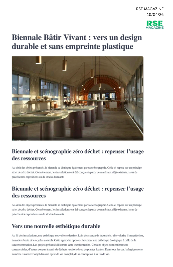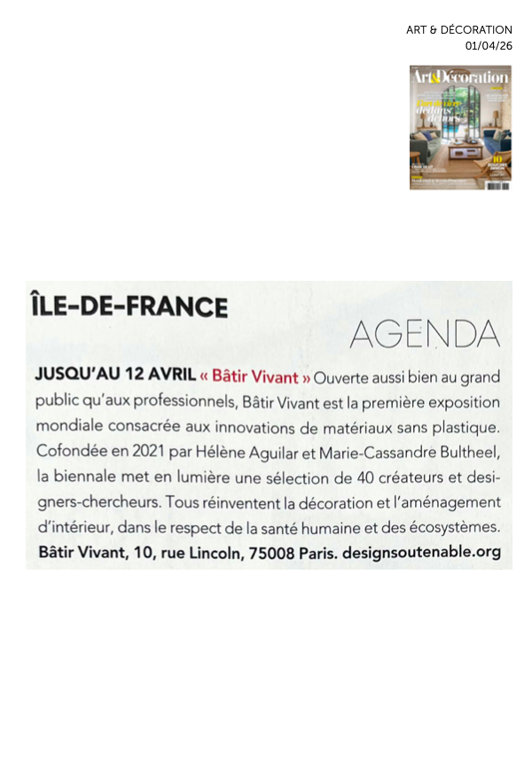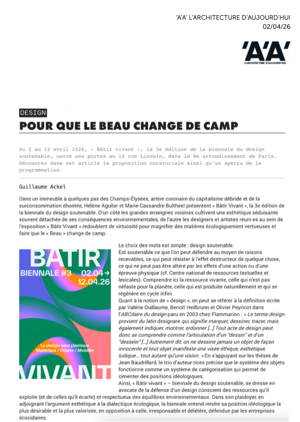 En avril 2026, après Frugal et Amour Vivant, le cycle se poursuit avec Bâtir Vivant. Forte de plus de 250 candidatures, la biennale retiendra une nouvelle fois quarante projets pour les révéler rue Lincoln, dans le 8ᵉ arrondissement de Paris.